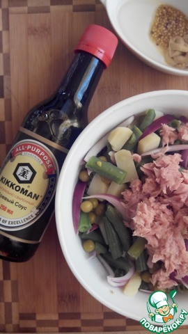 Соус: смешиваем соевый соус, оливковое масло и горчицу (я взяла двух видов - обычную и французскую).