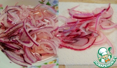 Лук нарезать тонкими полукольцами и замариновать его на 5 минут в холодной воде с уксусом. Затем выложить на бумажное полотенце и дать жидкости впитаться.