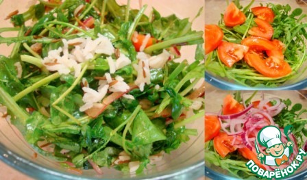 Смешать рукколу, свежие и вяленые томаты, лук, рыбу и рис.