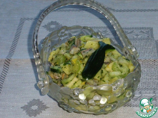 Салат получается сочным и свежим, каким-то "нашим"; на второй день он ничуть не хуже. Приятного аппетита! P.S. Для более праздничного варианта салата можно сельдь заменить на малосольную форель (удобно использовать недорогие наборы "для пива", ведь рыба все равно нарезается на кусочки). А украсить салат можно красной икрой.
