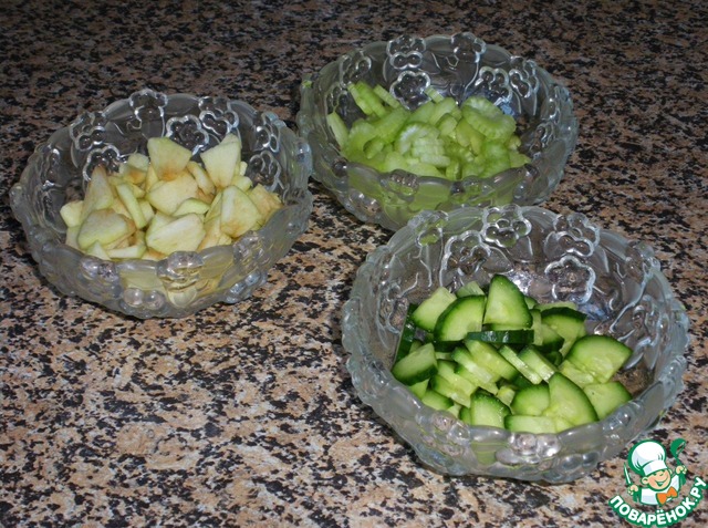 Так же крупно, как картофель (ведь салат брутальный!), порезать очищенное яблоко и огурец. Постараться освободить стебли сельдерея от жестких волокон, нарезать тонкими слайсами.
