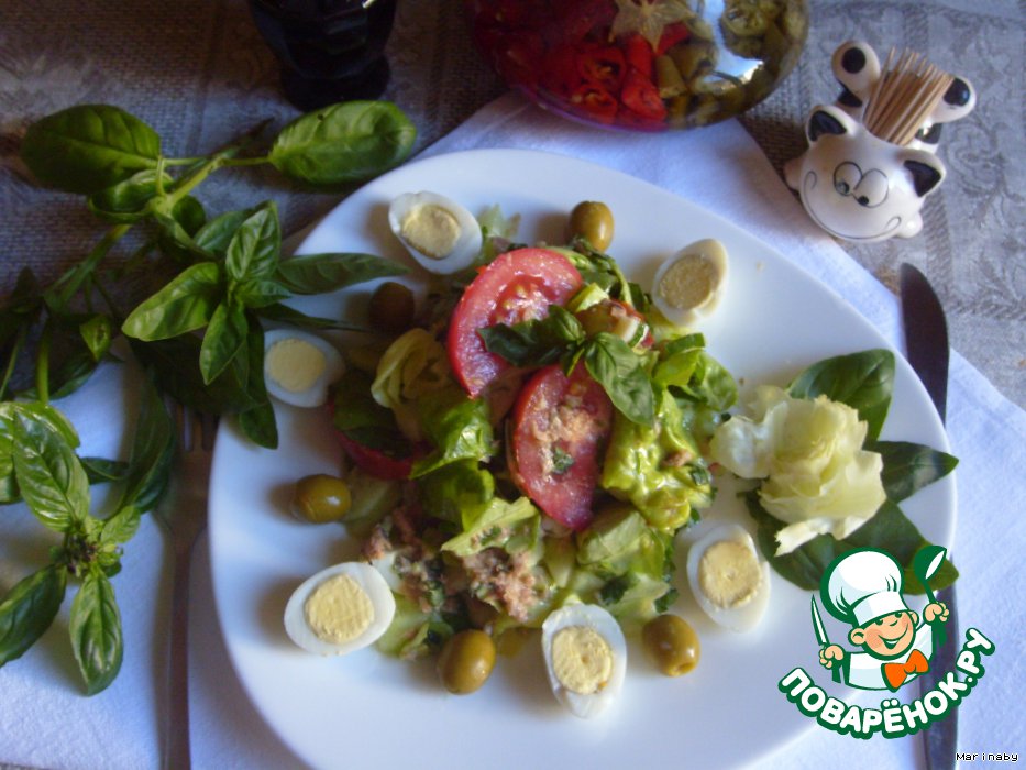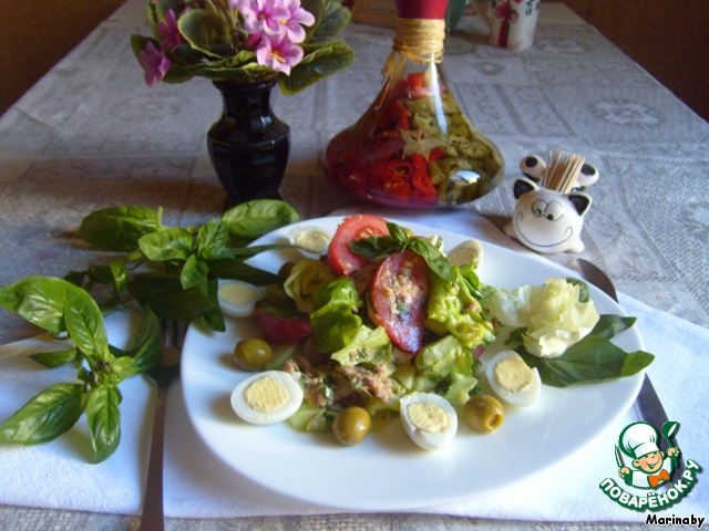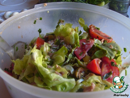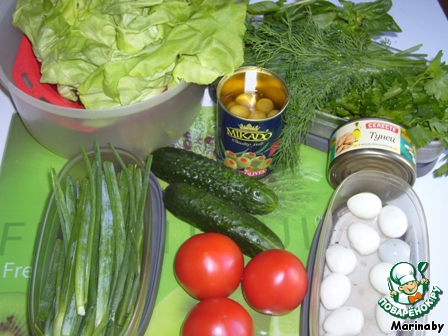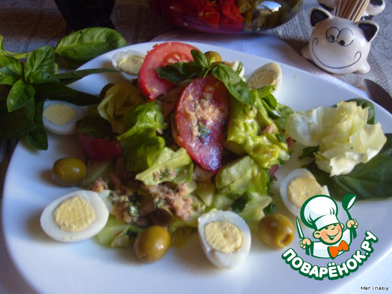 На салат выкладываем консервированный тунец, затем зелень и овощи, добавляем оливки и перепелиные яйца.