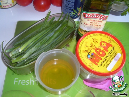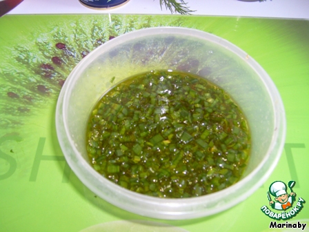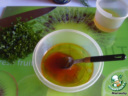 Итак, тщательно смешиваем мёд, оливковое масло и рассол от оливок.