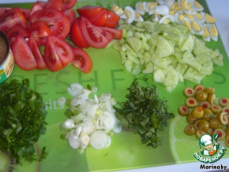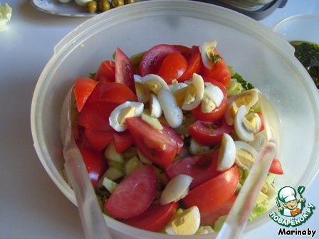 Огурец режем половинками (я очищаю от кожицы, это придает нежность салату), помидоры - дольками, белую часть зеленого лука - кружочками, зеленый базилик и петрушку - не очень мелко, оливки - пополам, перепелиные яйца - на четвертинки.
