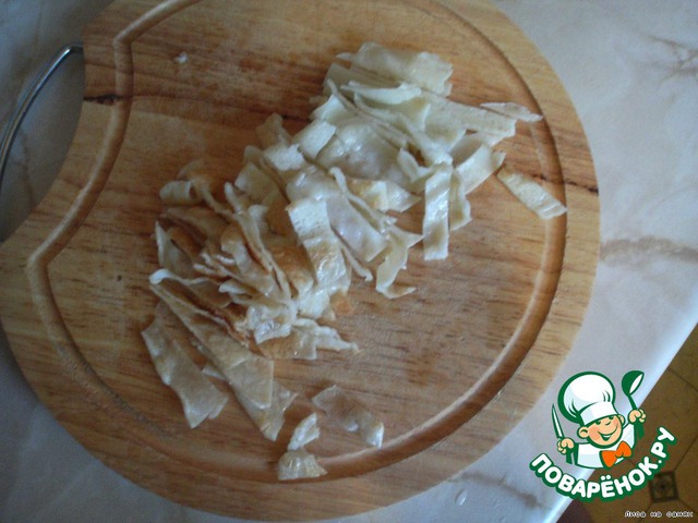 | Необычное сочетание рыбы и блинчиков из крахмала. Очень вкусный и сытный салат! |