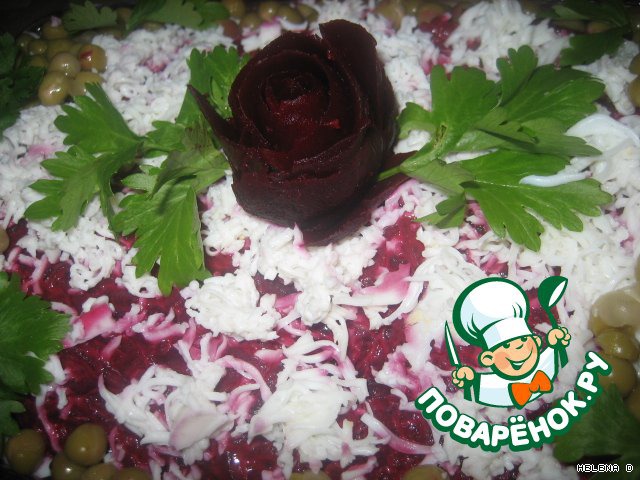 картофель, лук, майонез, сельдь, морковь, майонез, морковь, яйца, майонез и свекла, смешанная с майонезом