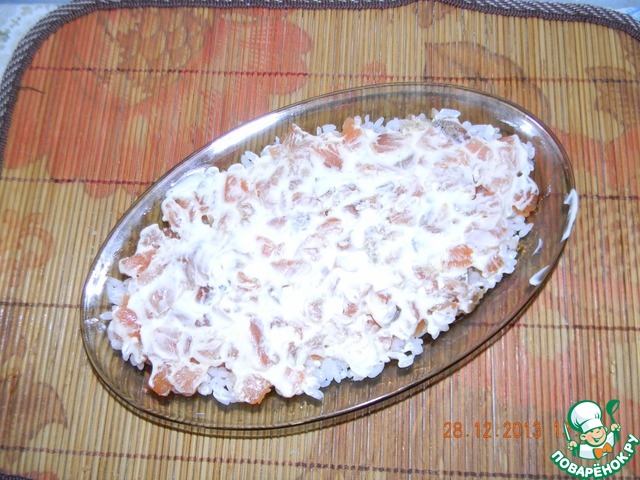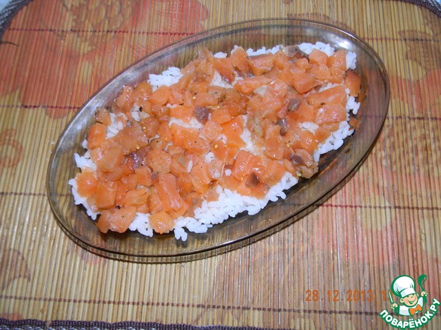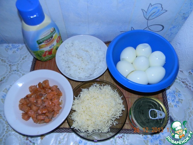 Берем такие ингредиенты. Рис отвариваем, семгу режем кубиками, яйцо сыр пропускаем через мелкую терку..