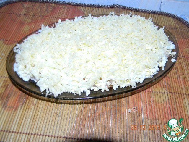 Следующий слой яйцо через терку и сыр, так же через терку...