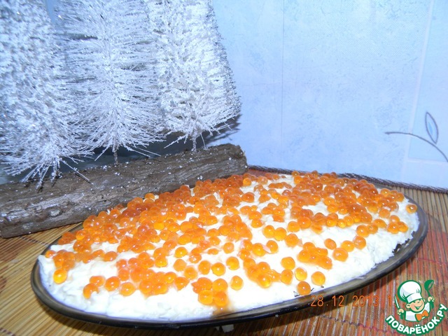 Намазываем майонезом и сверху красиво украшаем красной икрой..