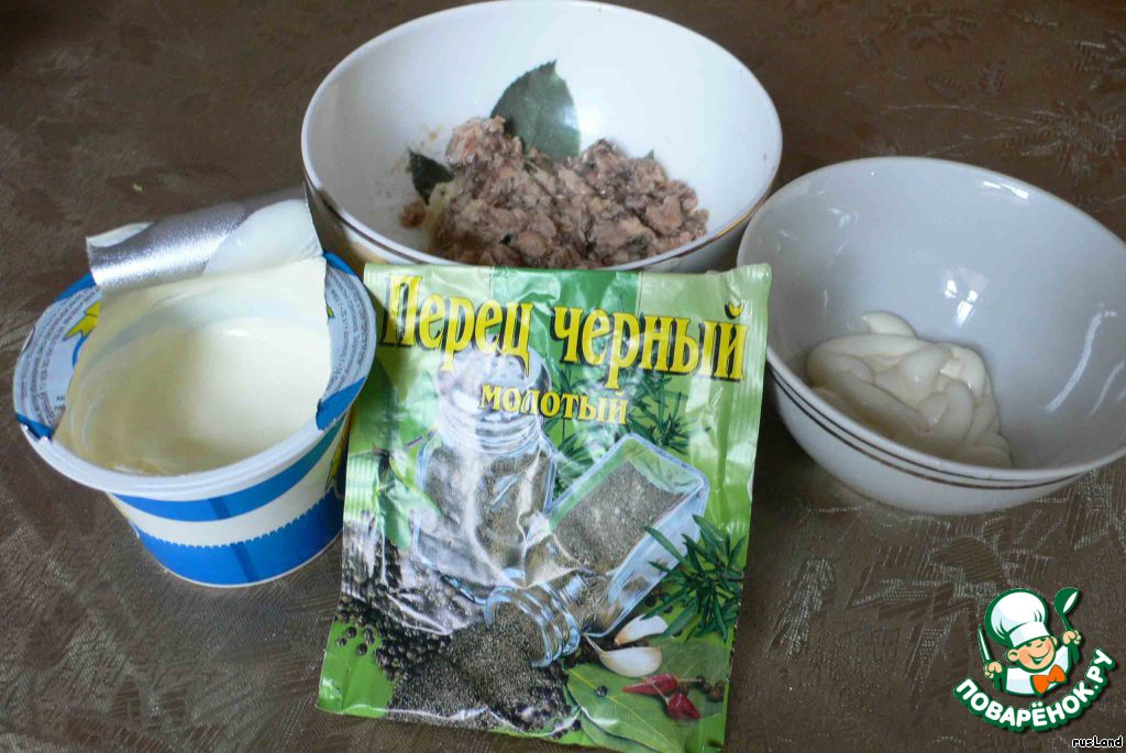 И, конечно, чудесный нежный соус: Все смешать в равных пропорциях («Хвост русалки в собственном соку» - сардинелла в масле, сметана, майонез, перец по вкусу). И соус готов. Очень вкусный, можно использовать для бутербродов.
