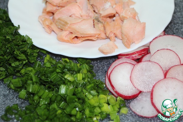 Отварную горбушу разобрать на мелкие кусочки, удалив кожу и попадающие косточки. Листья салата промыть, высушить, порвать руками. Редис нарезать тонкими колечками. Зеленый лук и петрушку мелко порубить.