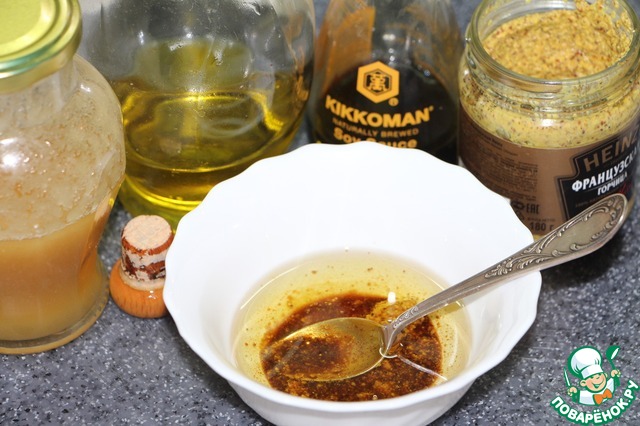 Для заправки смешать мед, оливковое масло, зерновую горчицу, соевый соус, взбить вилочкой до получения однородной массы.