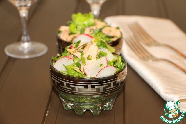 Зеленый салат с горбушей и редисом