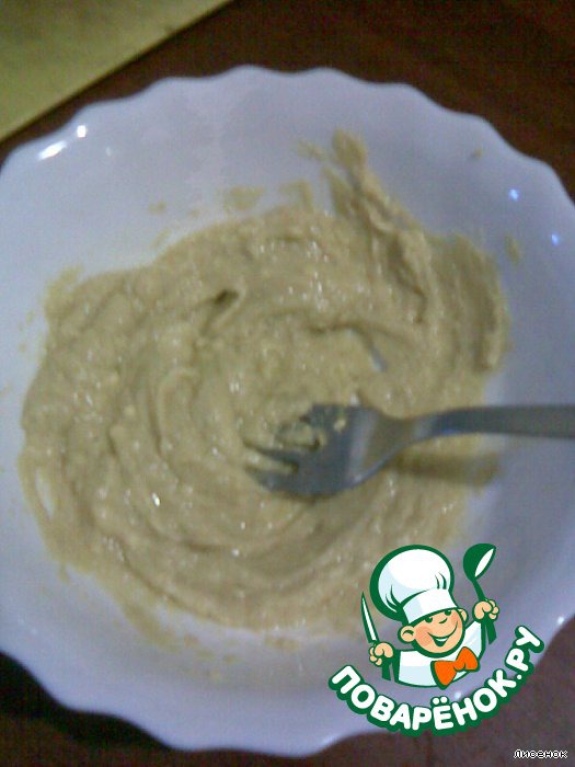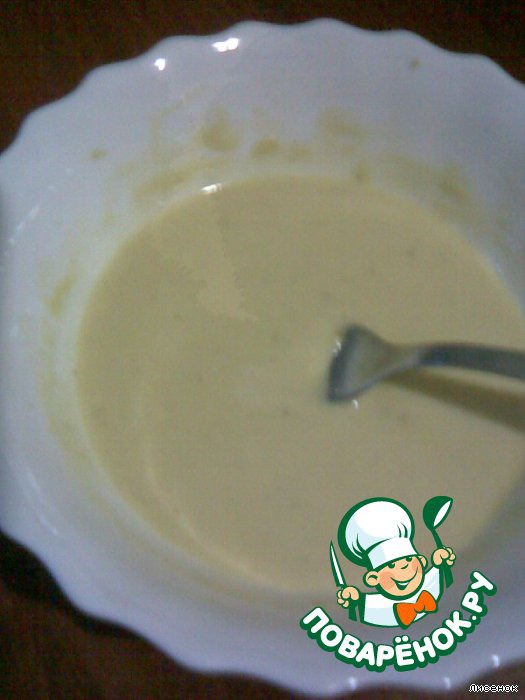 Растереть один желток с чайной ложкой горчицы,добавить масло(у меня ушло масла немного больше,чем 3 ст.л.,где-то 5)