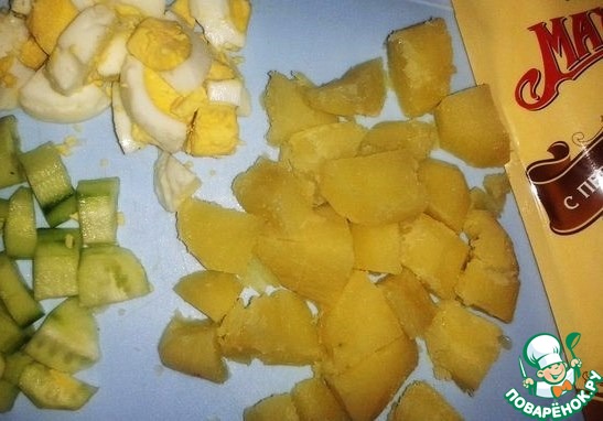 Крупно нарезать сваренное яйцо, картофель. Огурцы очистить от кожуры и так же крупно нарезать.
