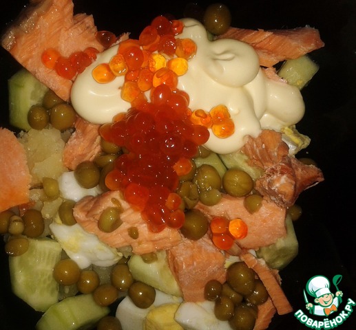 Смешать все ингредиенты, добавить майонез, горошек, красную икру.