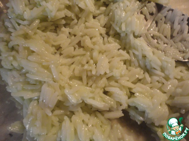 Рис отвариваем в подсоленой воде, добавляем васаби и рисовый уксус, хорошо перемешиваем.