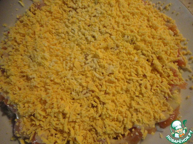 Следующий слой - тертые на мелкой терке вареные желтки.