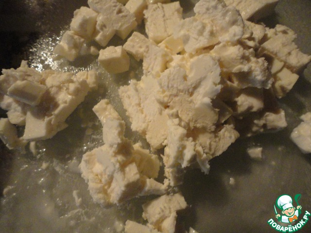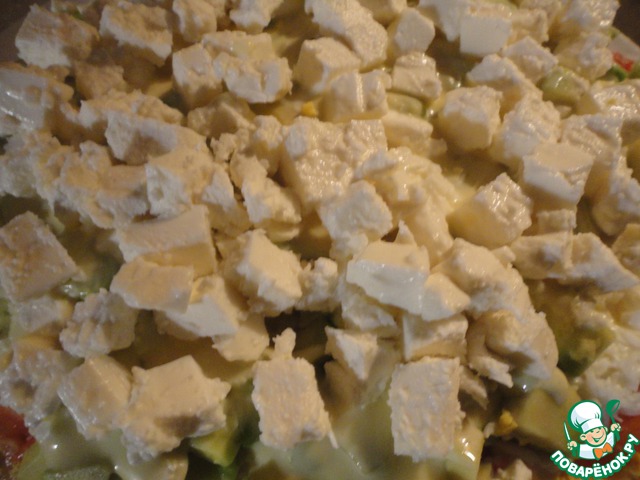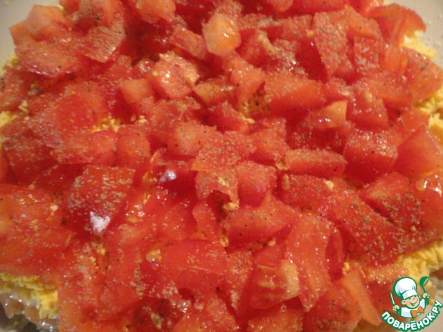 Далее - порезаный кубиками помидор. Помидор лучше брать мясистый. С небольшим количеством сока. Помидор подсаливаем и перчим.