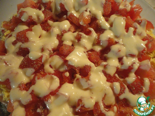 Сбрызгиваем помидор майонезом. Без фанатизма, салат и так достаточно калорийным выходит.