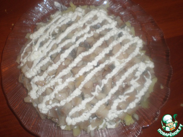 Филе сельди порезать небольшими кусочками и выложить на картофель с луком. Сделать сеточку из майонеза.