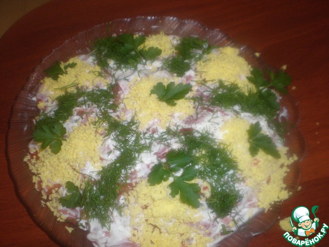 Верхний слой украсить тертыми желтками, зеленым луком, укропом, петрушкой. Дать салату немного настояться в холодильнике.