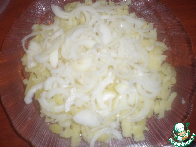 Сверху - порезанный тонкими полукольцами и промытый холодной водой лук.