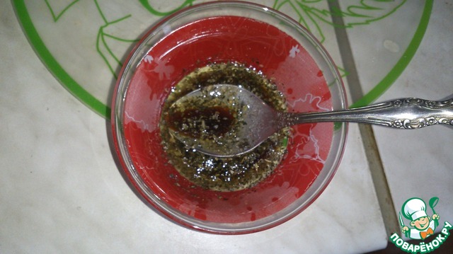 Первым делом - маринад: смешиваем соевый соус с растительным маслом (у меня было только аргановое, привезли из Марокко, но, думаю обычное тоже подойдет) и уксусом. Добавляем щепотку базилика или орегано и итальянские травы. Чуть солим и перчим.