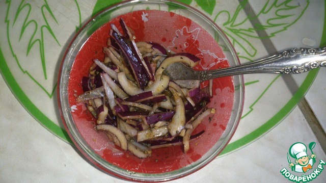 Режем лук четверть кольцами и кладем в маринад. Выдавливаем пару или больше зубчиков чеснока и тщательно перемешиваем. Ставим в холодильник на 1 час. Можно меньше, но не советую-))