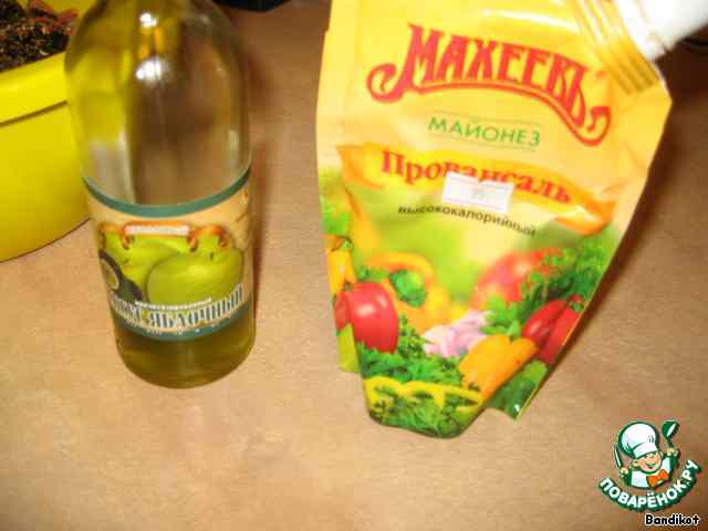 - готовим заправку: смешиваем майонез, уксус (можно 1/2 лимона), перец (по желанию), соль (добавить в последнюю очередь, если понадобится). Помните, рыба и чечил соленые!