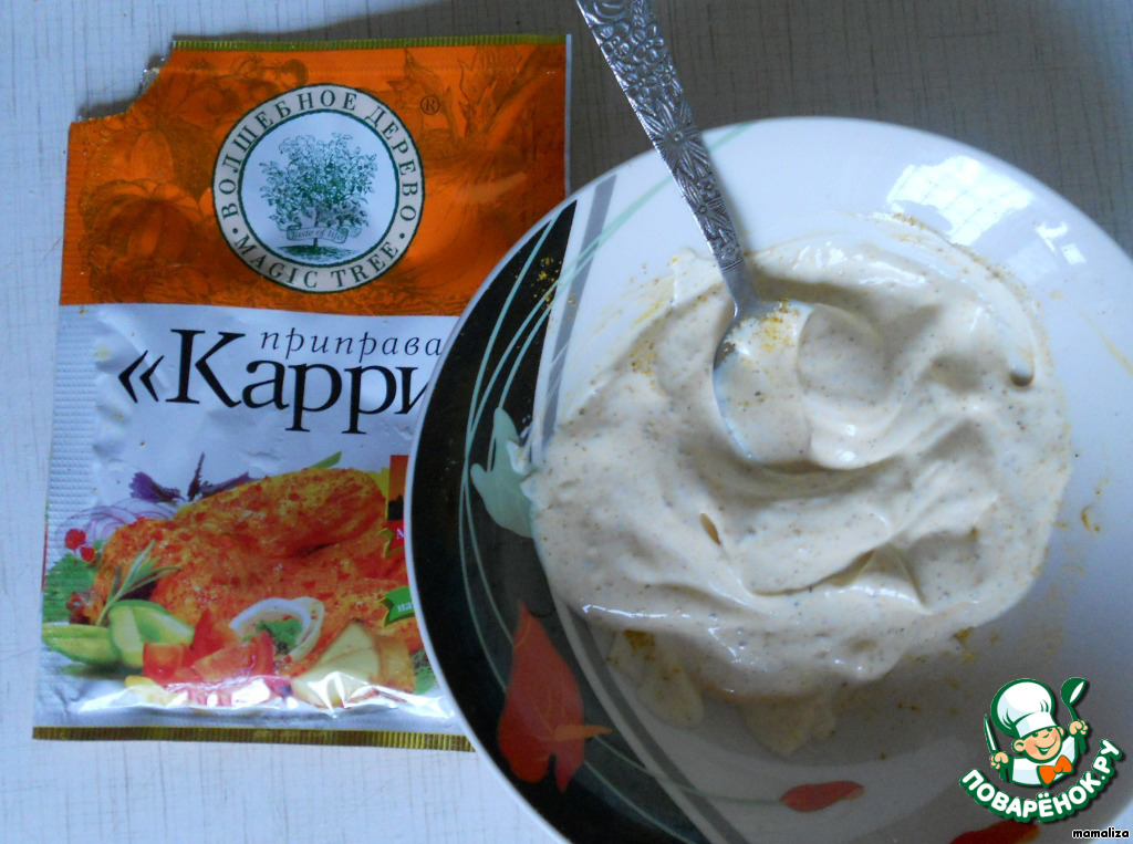 На лист салата выложить подготовленные овощи, добавить ломтики сельди, полить майонезом с каррри, посыпать зеленью.
