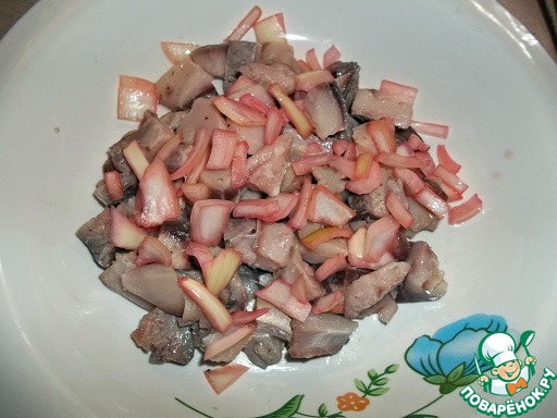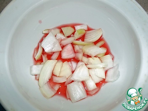 Лук мелко нарезать и, по желанию, ошпарить кипятком, или, как я, замариновать на несколько минут в 1ст. л. 5% винного уксуса, смешанного с 1ч. л. сахара.