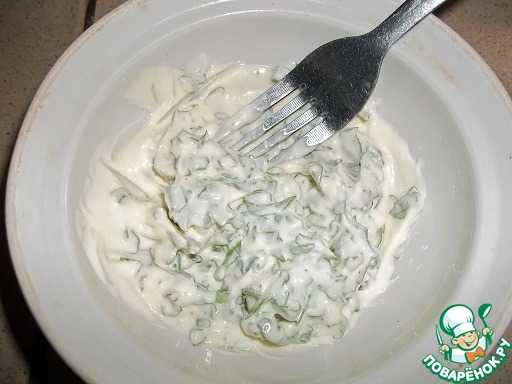 Мелко порубить веточку свежей зелени по-вкусу, у меня петрушка, смешать с 1ст. л. майонеза. Заправить овощи - морковь, баклажан и огурец.