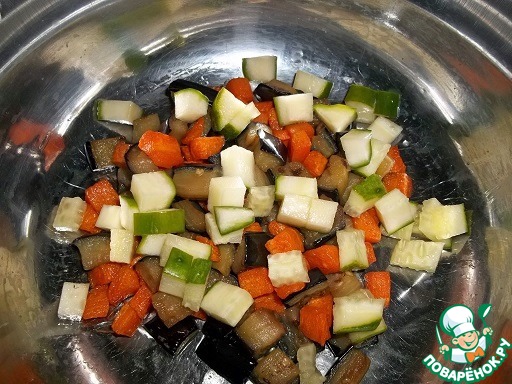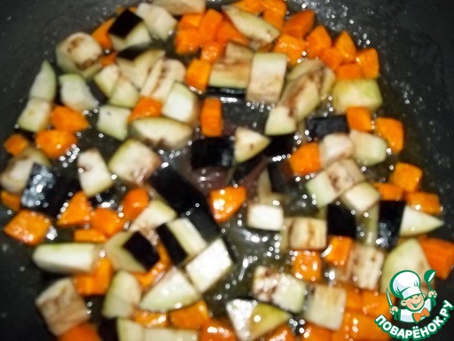 Баклажан и морковь нарезать небольшими кубиками. У меня баклажан свежий, кожицу не снимала. Баклажан посолить и оставить на 10-15 минут. Затем разогреть немного растительного масла в сковороде и обжарить сначала кубики моркови, затем добавить кубики баклажана. Жарить, помешивая до готовности овощей. Осторожно вынуть овощи со сковороды, избегая излишков масла.