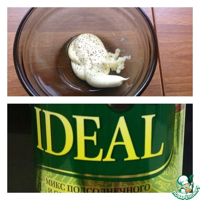 Делаем салатную заправку. В пиале смешиваем сметану или майонез, добавляем соль, перец, масло Идеал и пропущенный через пресс чеснок. Перемешиваем и поливаем рыбку.
