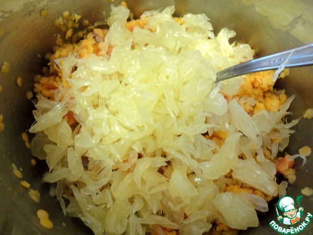 Помело очистить, удалить все сегменты прожилок и пленочек. Разломать мякоть на небольшие кусочки.