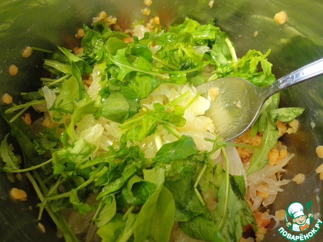 Рукколу вымыть, обсушить на бумажном полотенце и измельчить руками. Добавить рукколу, заправить оливковым маслом и сразу же подавать к столу. Хранению этот салат не подлежит!