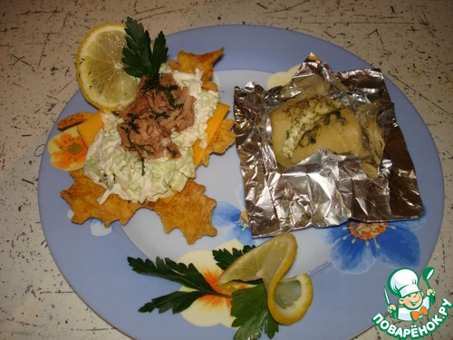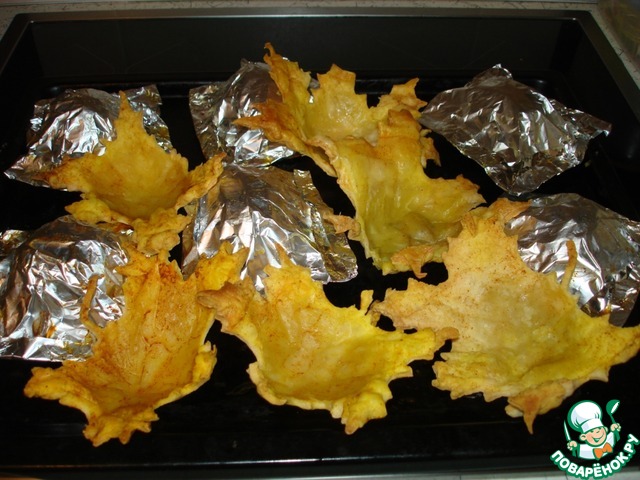 | Предлагаю попробовать салат с лёгким, свежим вкусом, в съедобных салатничках из "кленовых листьев"! Рецепт интересен ещё и тем, что как вспомогательный элемент, одновременно готовиться праздничный гарнир - запеченный с маслом и майонезом картофель! Очень вкусно! Угощайтесь! |