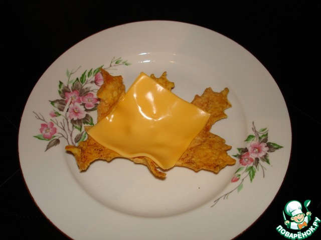 Разложить на листья ломтики сыра. Если в центре листа возникло вздутие, то просто придавить его.