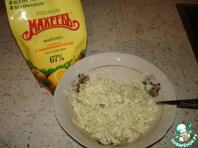 Тонко порезать капусту, натереть яйца на крупной, а сыр - на мелкой тёрке, порезать лук. Все смешать, заправить майонезом