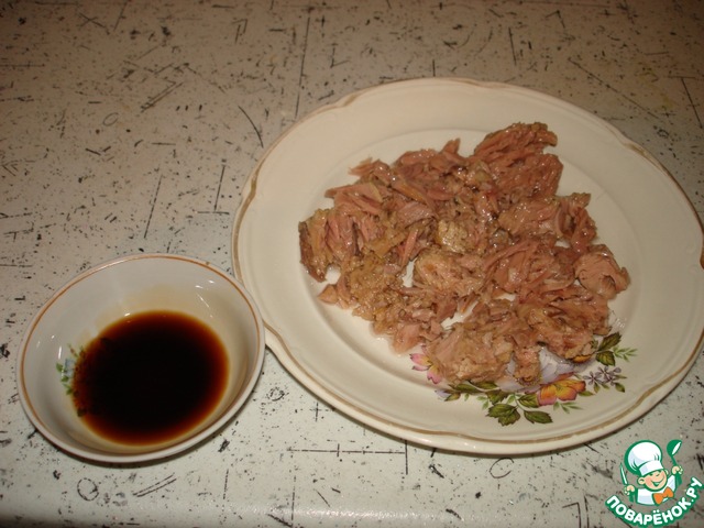 Тунец вынуть из жидкости и размять. Смешать соевый соус и рисовый уксус. Равномерно полить рыбу.