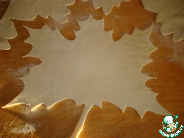 Вырезать из теста 6 кленовых листьев по картонному трафарету