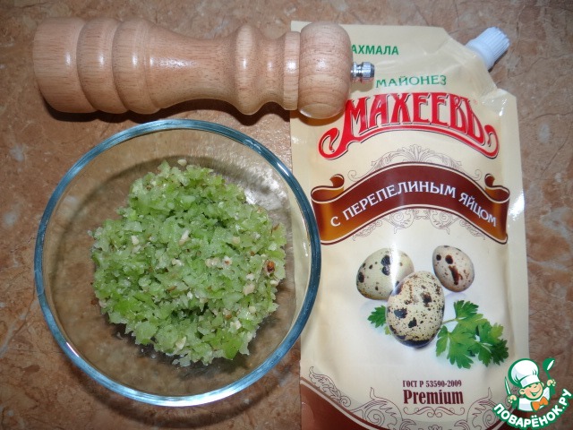 Посыпать перцем по вкусу, добавить 1ст. л. майонеза - размешать;