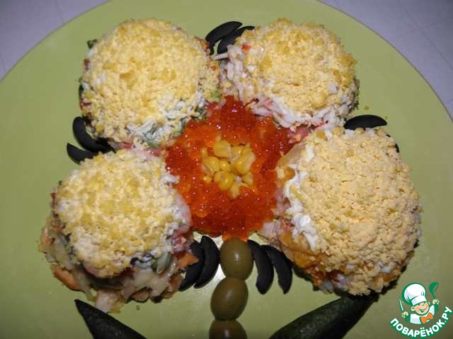 4ый лепесток: 1ый слой- отварной моркови с жаренным луком (можно добавить зелень), пропитать майонезом, 2ой слой-с/с семги 70г, 3ий слой- 1/3часть огурца пропитать майонезом, 4ый слой- 50г плавленого сырка, 5ый слой- 65г крабовых палочек пропитать майонезом, 6ой слой- белок, натертый на крупную терку, 7ой слой желток, натертый на мелкую терку