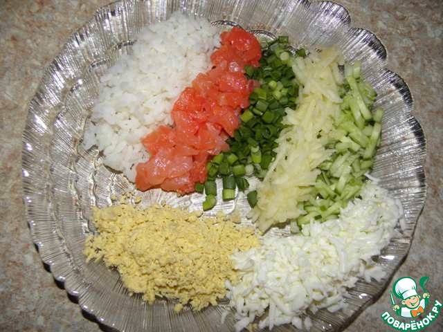 1ый лепесток: 1ый слой- 2ст. л отварного риса пропитать майонезом, 2слой-70г с/с семги, 3ий слой-зеленый лук пропитать майонезом, 4ый слой- 1/3ч яблока с лимонным соком, 5ый слой_ 1/3ч огурца пропитать майонезом, 6ой слой- белок натереть на крупной терке, 7ой слой- желток натереть на мелкой терке