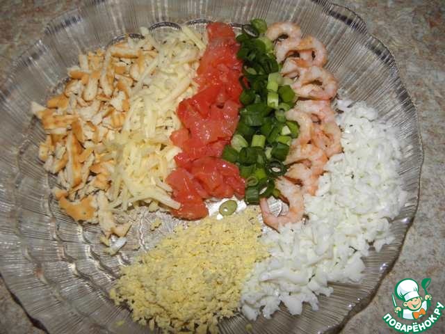 3ий лепесток: 1ый слой- крошку печенья крекера соленого пропитать майонезом, 2ой слой-50г твердого сыра, 3ий слой с/с семги пропитать майонезом, 4ый слой-зеленый лук, 5ый слой 65г отварных креветок пропитать майонезом, 6ой слой- белок, натертый на крупной терке, 7ой слой-желток, натертый на мелкой терке.
