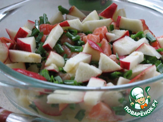 Яблоко и рыбу нарезать небольшими ломтиками.