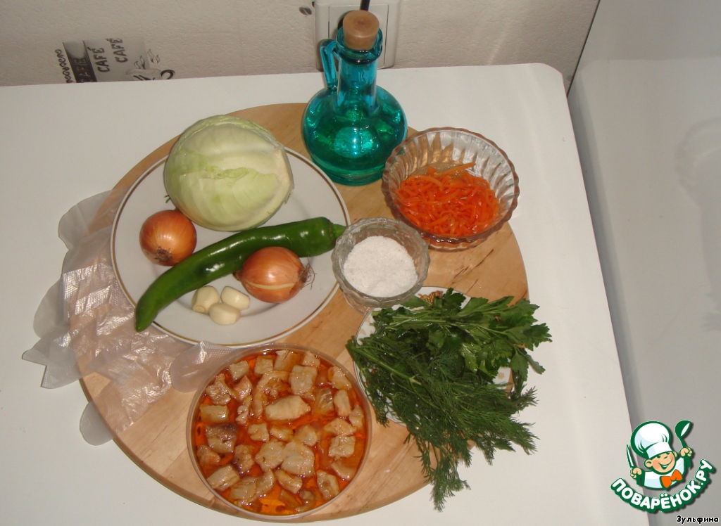 Приготовить все ингредиенты: кочанную капусту, морковь по-корейски, рыбу «Хе». Отнеситесь внимательно к покупке пресервы – не выбирайте рыбу «Хе» из селёдки, желательно купить из судака. Если пресервы рыбы уже с марковкой, тогда морковь по-корейски покупать не надо. Для соуса приготовить: перчик Чили, лук репчатый, зелень (петрушка и укроп в равных пропорциях), чеснок, соль, растительное масло, кипяченая вода). Дополнительно для соуса приготовьте пищевые перчатки, они понадобятся для разделки перца Чили.