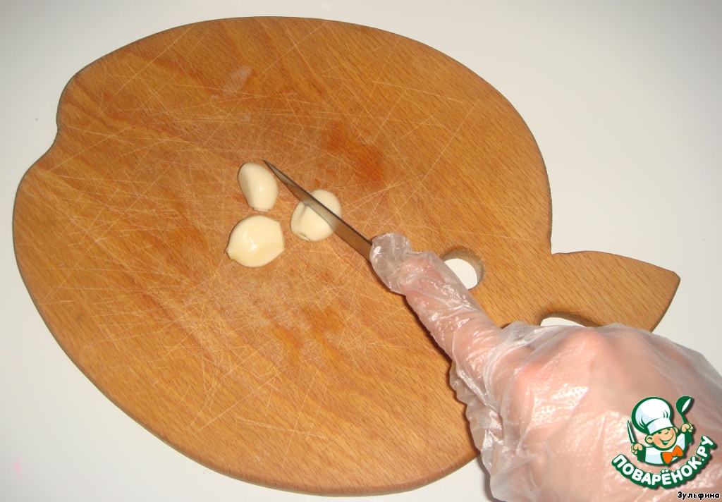 Чеснок вымыть, почистить. Крупные зубчики разрезать пополам.