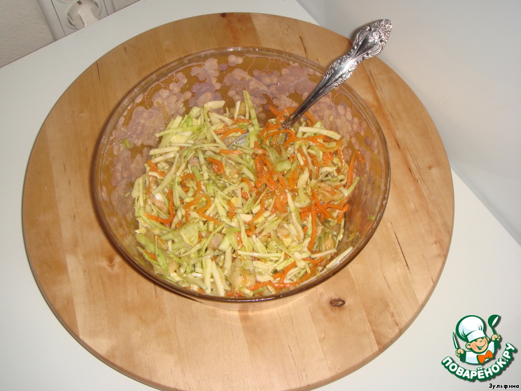 Смешать все ингредиенты (свежую капусту, соус, морковь, рыбу «Хе»).